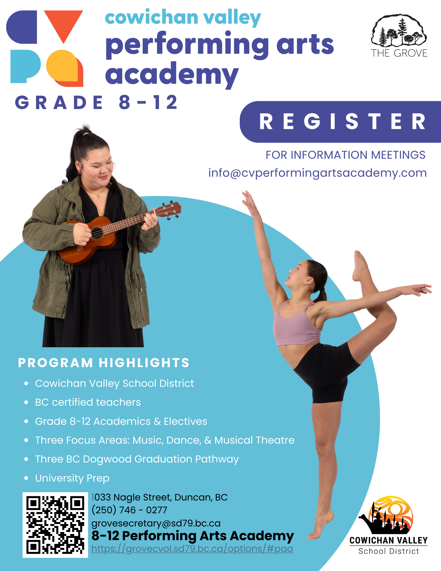 The Cowichan Valley Performing Arts Academy (CVPAA) embodies the Whole Performing Artist Approach, emphasizing cultural understanding, technical training, and integrated academics, fostering holistic development aligned with the BC Curriculum. This full-time, year-long program is designed for enthusiastic students in grades 8-12 interested in experiential learning, dance, music, and theatre.